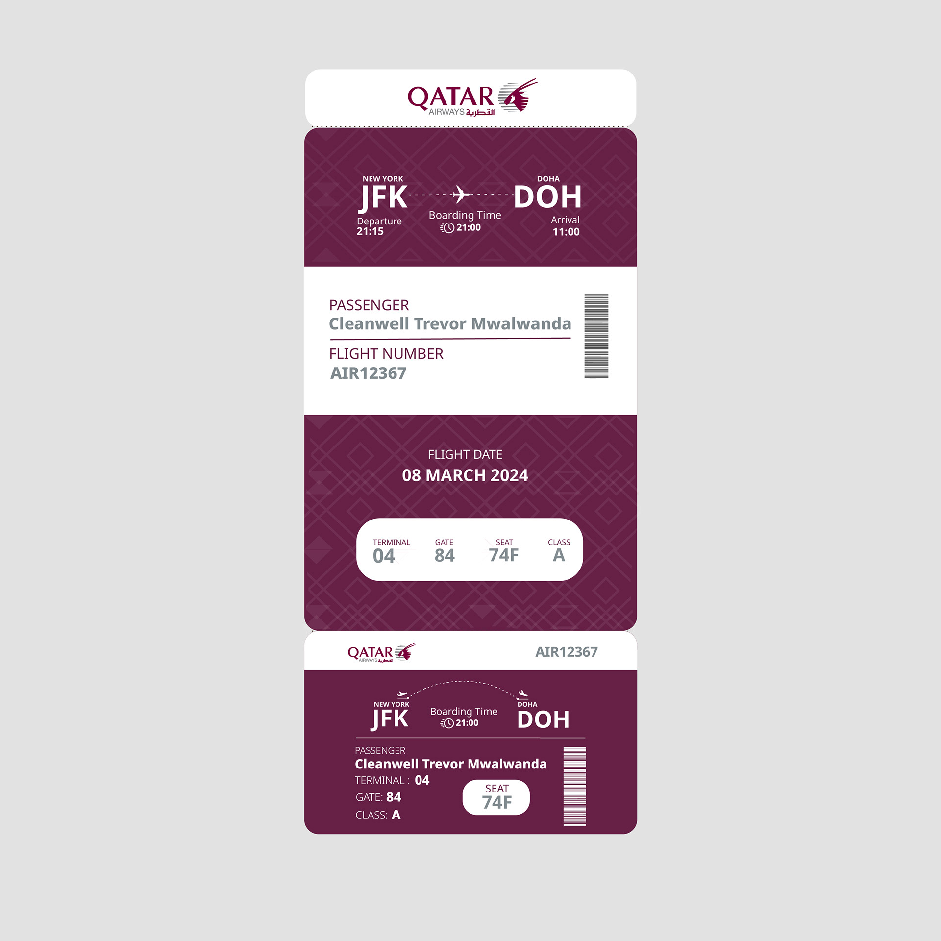This boarding pass design was created as part of a class project. The challenge was to make travel details easier to read while ensuring that all information is displayed clearly—not just replaced with symbols that may confuse first-time travelers. The design focuses on creating a smooth flow of information, highlighting essentials such as departure, arrival, boarding time, gate, and seat assignment. By balancing text with visual elements, the layout makes it simple for both new and frequent travelers to quickly find what they need without losing any important details.