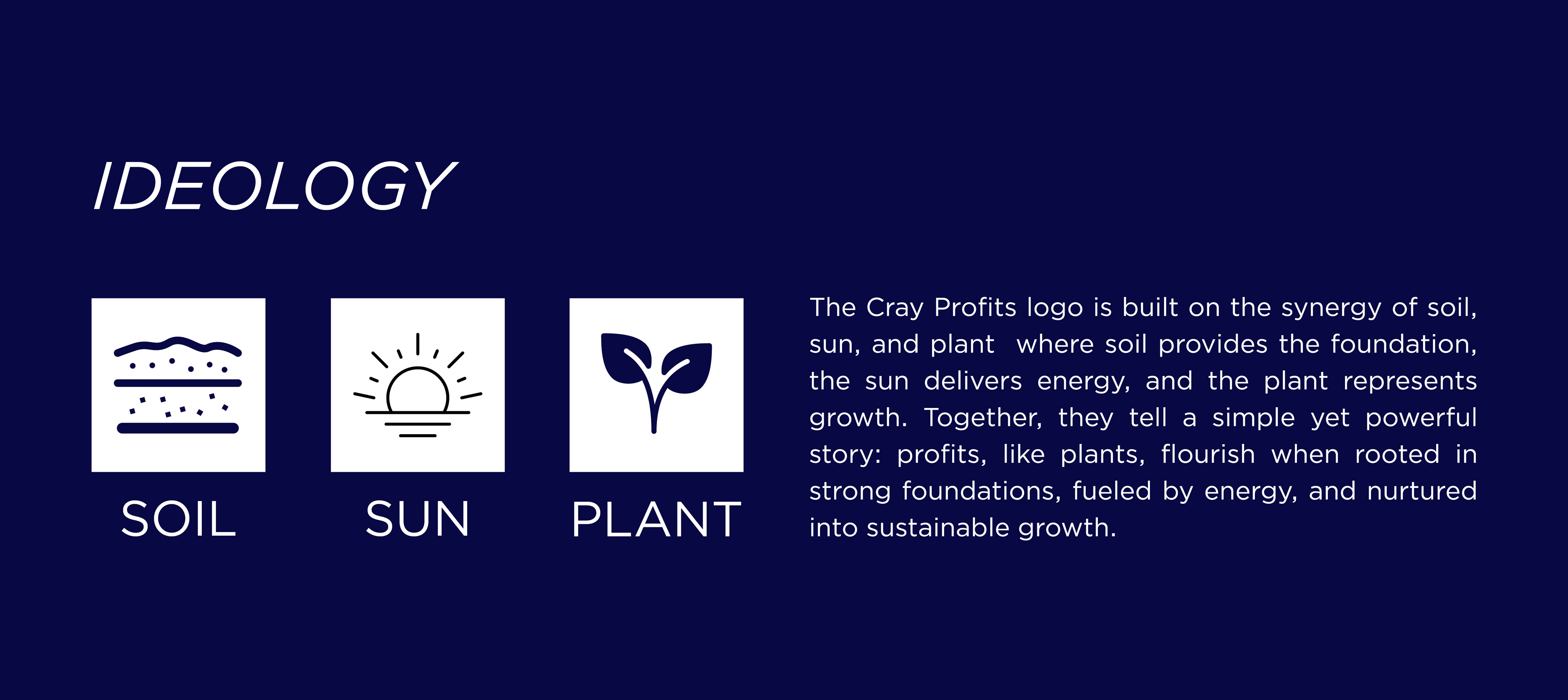 I designed the Cray Profits logo for a small company dedicated to agriculture and sustainability. The concept is built on the synergy of soil (foundation), sun (energy), and plant (growth) showing how profits, like plants, thrive when rooted in strong foundations, fueled by energy, and nurtured toward sustainable growth.